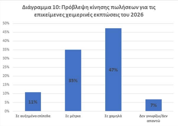 Ιδιαίτερα ανησυχητική είναι και η εικόνα που διαμορφώνεται ενόψει των χειμερινών εκπτώσεων του 2026, καθώς οι επιχειρήσεις εμφανίζονται εξαιρετικά συγκρατημένες στις προβλέψεις τους, αναμένοντας χαμηλή έως μέτρια αγοραστική κίνηση. Η εξέλιξη αυτή επηρεάζει άμεσα τον επιχειρηματικό σχεδιασμό, περιορίζοντας κάθε δυνατότητα ανάπτυξης και ενίσχυσης της απασχόλησης.
