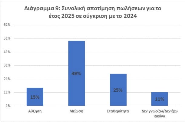 Σύμφωνα με τα στοιχεία της έρευνας, περισσότερες από τις μισές εμπορικές επιχειρήσεις (52%) παρουσίασαν χαμηλότερες πωλήσεις σε σχέση με την αντίστοιχη περσινή περίοδο, ενώ ένα επιπλέον 32% κινήθηκε απλώς στα ίδια επίπεδα. Για το σύνολο του 2025, σχεδόν οι μισές επιχειρήσεις (49%) εκτιμούν μείωση του κύκλου εργασιών τους, γεγονός που αποτυπώνει τη διαρκή πίεση που δέχεται η αγορά.