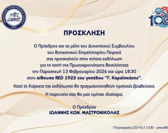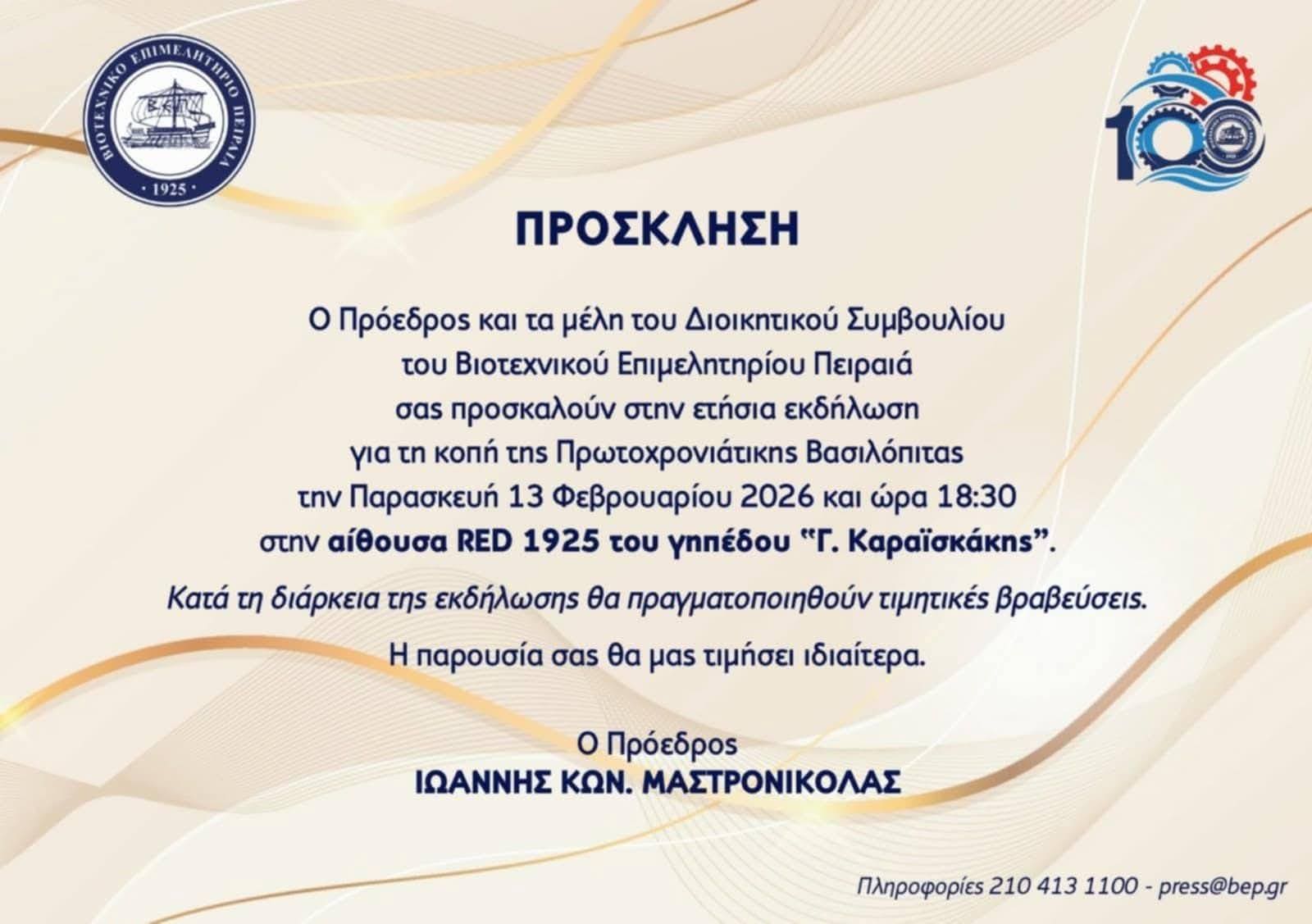 Το Βιοτεχνικό Επιμελητήριο Πειραιά (ΒΕΠ) πραγματοποίησε την Παρασκευή 13 Φεβρουαρίου 2026 την ετήσια εκδήλωση κοπής της πρωτοχρονιάτικης πίτας με πλήθος κόσμου, στην αίθουσα «Red 1925» του Σταδίου «Γ. Καραϊσκάκης», σε ιδιαίτερα θερμό και εορταστικό κλίμα.